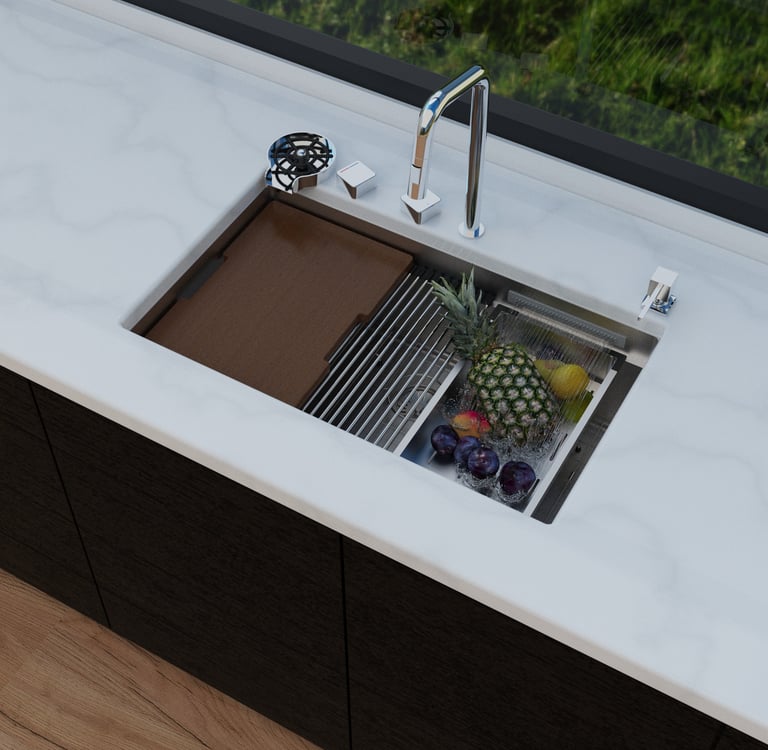 True refinement comes when the collection is conceived as a whole. A workstation sink designed with ledges that welcome accessories, a faucet echoing the same finish, a soap dispenser that feels like it was always meant to be there. That sense of coherence is what separates a merely functional kitchen from one that feels intentional.